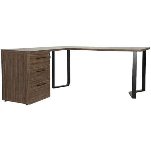 Escritorio secretarial en “L”, cubierta en melamina de 28 mm. y canto rigido en PVC del mismo tono de la cubierta, estructura metálica rectangular de 2¼”x3/4” cal. 18, terminado en pintura epóxica electrostatica, lateral con archivero pedestal fabricado en melamina de 16 mm. (2 cajones lapiceros y 1 cajon archivo), con chapa