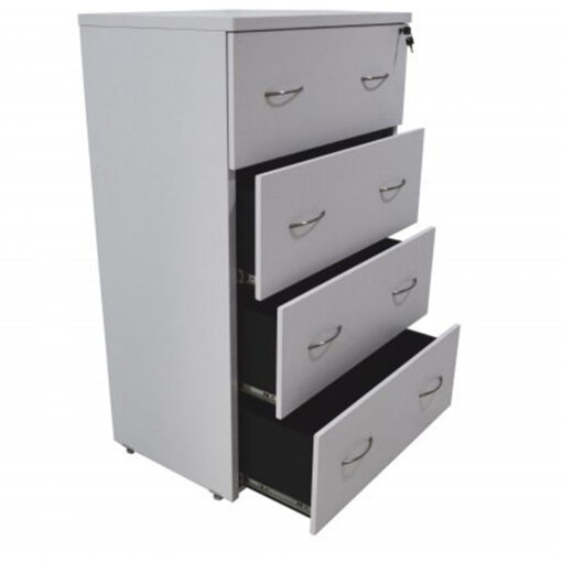 Archivero horizontal con 4 gavetas, fabricado en melamina de 28 y 16 mm de espesor color a elección, con correderas de extensión embalinadas reforzadas, canto en PVC termo adherido, con niveladores, mecanismo de cierre general con llave, medidas 0.80×0.50×1.25