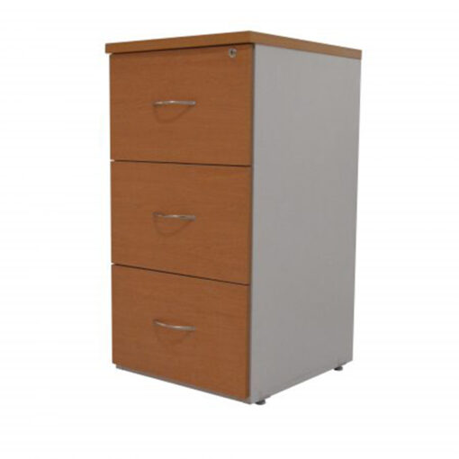 Archivero vertical con 3 gavetas, fabricado en melamina de 28 y 16 mm de espesor color a elección, con correderas de extensión embalinadas reforzadas, canto en PVC termo adherido, con niveladores, mecanismo de cierre general con llave, medidas 0.50×0.55×0.95