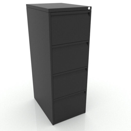 Archivero metálico vertical con cuatro gavetas, fabricado en lámina de acero calibre 24, corredera de extensión, chapa de seguridad, medidas 0.47×0.65×1.30
