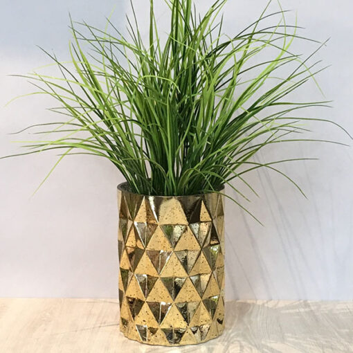Arreglo base de vidrio texturizada color oro, ideal para decoración de oficina o casa