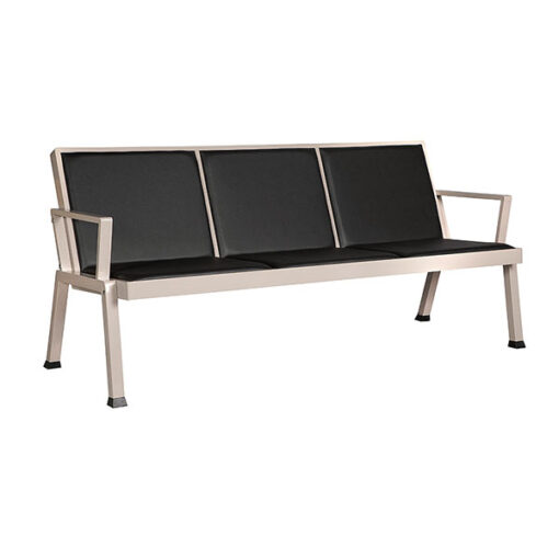 Banca tandem estructura fabricada a base de lamina de acero rolado en frio cal. 18, con doble curvatura en los extremos, soporte horizontal fabricado en perfil rectangular de acero rolado en frio cal. 14, pata y descansa brazos fabricados en lamina de acero rolado en frio cal. 18. Regatones en Goma Color Negro, asiento y respaldo con pad tapizado en vinil color negro, ensamblados en patas y soporte por medio de anclajes de aluminio con embellecedores de aluminio pulido, soporte horizontal ensamblado con sujetador de estructura en lamina de acero en frio cal. 12 totalmente armada, peso aproximado de resistencia 150 kg x asiento, disponible para 2, 3 y 4 plazas