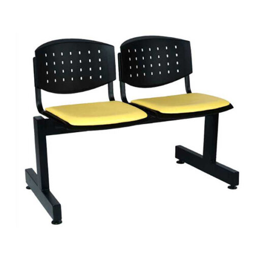Banca visitante de 2 plazas estructura travesaño y patas perfil rectangular de 1½”x3” cal. 18, soporte de respaldo en tubular ovalado de 1” cal. 16, terminado en pintura epóxica texturizada color negro, niveladores de 2” de polietileno. Respaldo en polipropileno color negro, asiento con pad tapizado en tela o vinil color a elección.
