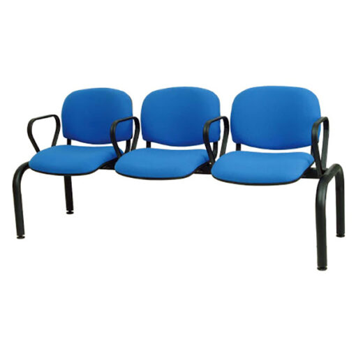 Banca visitante de 3 plazas con descansabrazos, estructura con travesaño perfil cuadrado de 2” cal. 14 patas en perfil redondo de 2” cal. 16, terminado en pintura epóxica texturizada, niveladores de 2” de polietileno con tornillo de 5/16″ para compensar desniveles del piso. Asiento y respaldo tapizados en tela o vinil color a elección