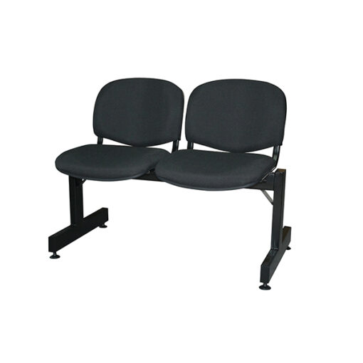 Banca visitante de 2 plazas estructura con travesaño y patas perfil rectangular de 1½”x3” cal. 18, soporte de respaldo en tubular ovalado de 1” cal. 16, terminado en pintura epóxica texturizada color negro, niveladores de 2” de polietileno con tornillo de 5/16” para ajuste de altura. Asiento y respaldo tapizados en tela o vinil color a elección.