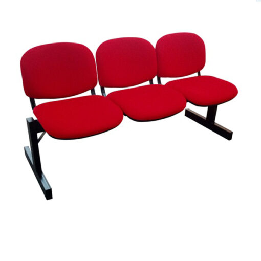Banca visitante de 3 plazas estructura con travesaño y patas perfil rectangular de 1½”x3” cal. 18, soporte de respaldo en tubular ovalado de 1” cal. 16, terminado en pintura epóxica texturizada color negro, niveladores de 2” de polietileno con tornillo de 5/16” para ajuste de altura. Asiento y respaldo tapizados en tela o vinil color a elección.
