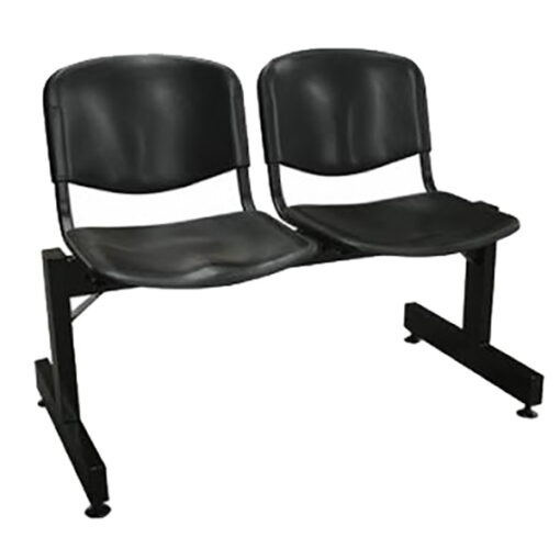 Banca visitante de 2 plazas estructura con travesaño y patas perfil rectangular de 1½”x3” cal. 18, soporte de respaldo en tubular ovalado de 1” cal. 16, terminado en pintura epóxica texturizada color negro, niveladores de 2” de polietileno con tornillo de 5/16” para ajuste de altura. Asiento y respaldo tapizados en tela o vinil color a elección.