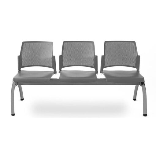 Banca 3 plazas, base de 4 patas en tubular acero pintado en negro, gris y negro, con asiento y respaldo multiperforado en polipropileno. Para uso interno. Kit tapiz y juego de brazos opcional.