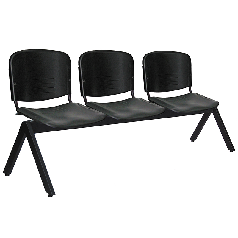 Banca visitante de 3 plazas estructura: de acero tubular rectangular de 1 1/2″ X 3″, calibre 16, asientos y respaldos de perfíl redondo tubular de acero con travesaños separadores tubulares redondos de acero con acabado de pintura epóxica (electrostática) color negro mate. Respaldo y asiento: en dos piezas en polipropileno de alta resistencia y duración. Color: negro. Peso máximo de resistencia: 300 kgs.