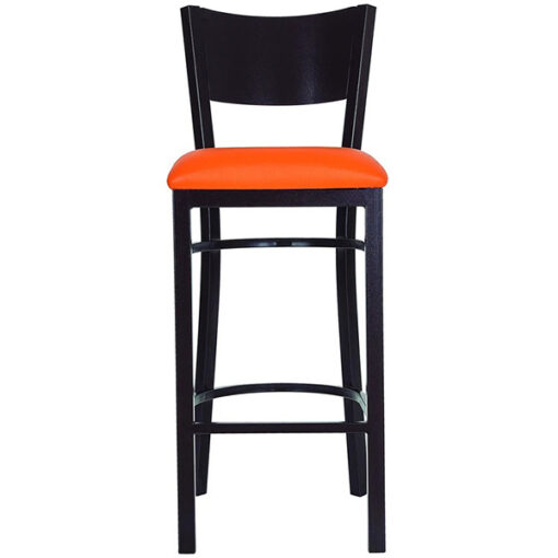 Banco Restaurante con estructura en tubo cuadrado en patas y respaldo de 1¼” cal. 18, tubo cuadrado en asiento y refuerzo de 3/4” cal. 18 y lamina de acero en respaldo cal. 16. Asiento en aglomerado de 19 mm., hule espuma de 6 cms., d.24 kgs/m³, tapizado en variedad de colores (consultar catalogo tapices). Accesorios tapón de polipropileno de alto impacto en patas y respaldo.