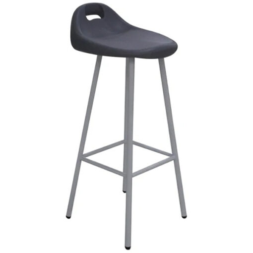 Banco Alto con estructura en tubo redondo de 7/8″ cal. 18 en patas, tubo redondo de 5/8″ cal. 18 en descansa pies y solera de 1/8 x 1″, terminado en pintura epóxica, colores en negro y aluminio. Asiento en polietileno de alta densidad, con protección uv, insertos ¼-20×13 mm., retardante de flama grado ul 94hb, 100% reciclable, Colores negro, gris y azul