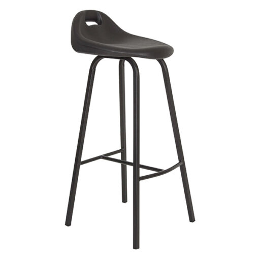 Banco Alto estructura en tubo redondo de 3/4″ cal. 18 en patas, tubo redondo de 5/8″ cal. 18 en descansa pies, terminado en pintura epóxica, colores en negro y aluminio. Asiento en polietileno de alta densidad, con protección uv, insertos ¼-20×13 mm., retardante de flama grado ul 94hb, 100% reciclable, colores negro, gris y azul