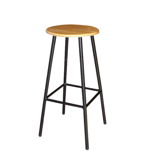 Banco alto con estructura en tubo redondo de 7/8” cal. 18, descansa pies con tubo redondo de 5/8” cal. 18, pintura epoxica en color negro, asiento en madera de pino natural de 1a. Calidad de 16 mm., terminado en barniz resistente, regatones en polietileno de alta densidad, tapón redondo tipo bola color negro.