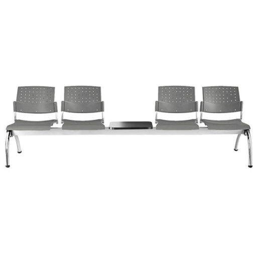 Nuevo estilo para tus áreas de espera. Banca de cuatro plazas con mesa. Base de 4 patas en tubular de acero pintado en negro, gris y cromado. Asiento y respaldo en polipropileno con gran variedad de colores.
