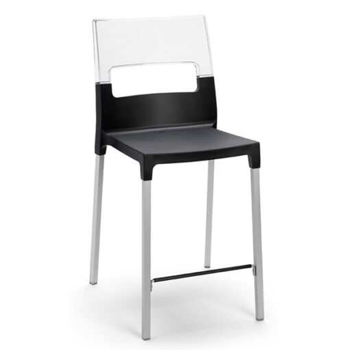 Banco con asiento en polipropileno reforzado con fibra de vidrio. Respaldo en policarbonato transparente. Apilable.