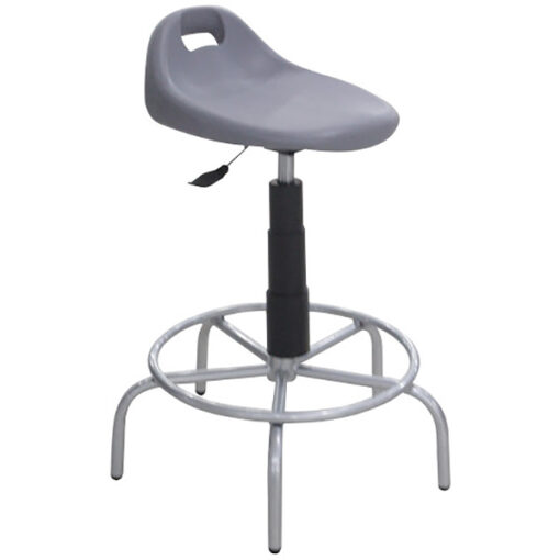 Banco asiento en polietileno de alta densidad, con protección UV, 100% reciclaba, colores: negro, gris y azul. Sistema de elevación pistón de gas, mecanismo cajero, ajuste neumático de altura. Base de tubo redondo de 7/8″ de 5 puntas, con descansa pies integrado, terminado en pintura color aluminio o negro