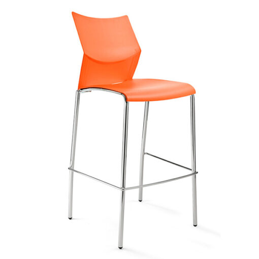 Banco con asiento y respaldo en polipropileno, con base de 4 patas en tubular de acero pintado en gris o cromado con descansapies. Para uso interno.