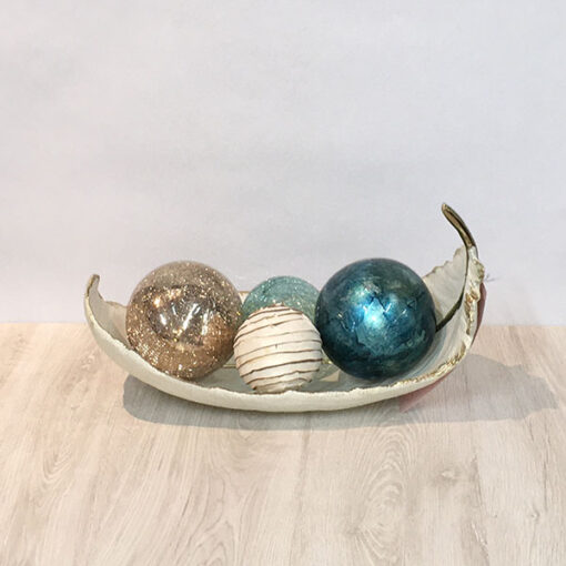 Base en forma de pluma blanca con dorado arreglada con esferas, ideal para complementar la decoracion de tu espacio en casa u oficina