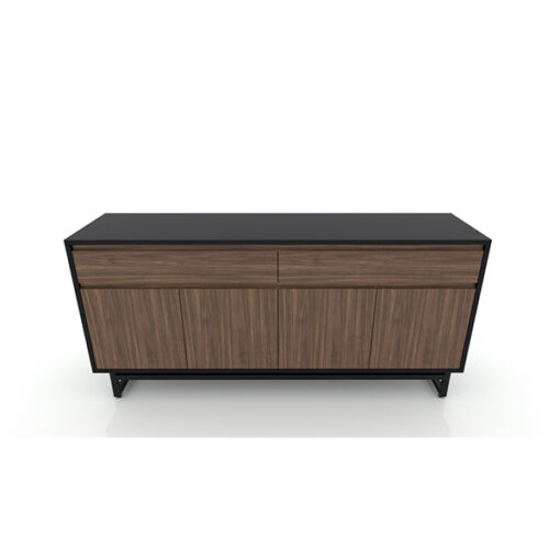 Credenza Minimalista con 4 puertas abatibles, y dos cajones papeleros parte superior, jaladera integrada en puertas y cajones, estructura metálica tubular cuadrado 1″x1”. Fabricada en melamina de 28mm. Frentes embutidos. Medidas: 160x40x75cm.