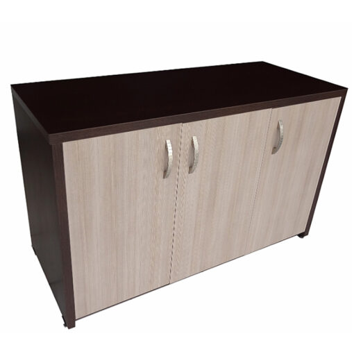 Credenza con tres puertas con chapa y entrepaño interno, fabricada en melamina de 28 y 16 mm de espesor color a elección, cantos en pvc termo adherido, medidas 1.50×0.40×0.75
