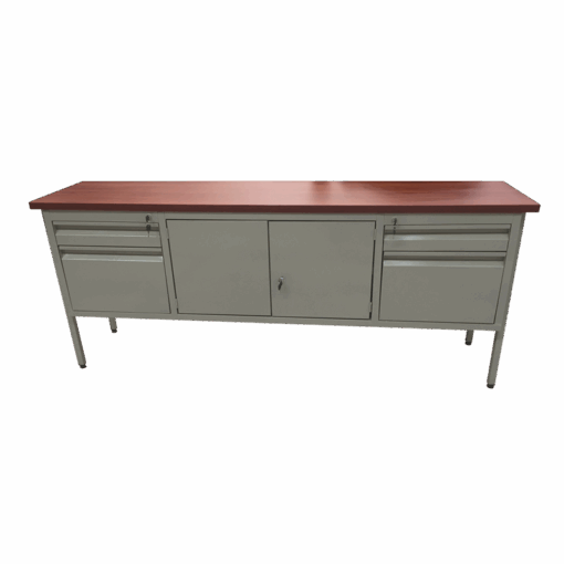 Credenza ejecutiva metálica fabricada en lamina de acero calibre 24 cubierta de melamina 28mm de espesor color a elección cantos PVC, con dos cajoneras a los extremos y puertas corredizas al centro, medidas 1.80×0.45×0.75