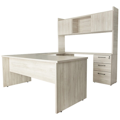 Escritorio ejecutivo en “U”, cubierta en melamina de 28 mm. y canto rigido en PVC del mismo tono de la cubierta, patas en melamina de 28 mm con faldon de melamina de 16 mm, lateral en melamina de 28 mm. y canto rigido en PVC credenza en melamina de 28 mm., con archivero pedestal en melamina de 16 mm
