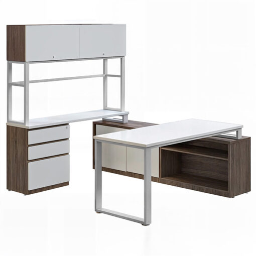 Conjunto ejecutivo formado por Escritorio cubierta en 28mm y base metálica 3×1″. Credenza lateral baja puertas corredizas y 2 claros organizadores. Credenza posterior cubierta en 28mm, archivero horizontal pedestal (2 cajones papeleros y 1 cajon de archivo). Librero sobre credenza, 2 puertas abatibles con pistón y estructura metálica con refuerzos 1×1″ y patas en 2×1″. *Jaladera integrada. *Incluye cerradura en pedestal y librero. Medidas Escritorio: 160x70x75cm. Credenza lateral: 210x40x60cm. Credenza alta: 160x40x75cm. Librero: 160x35x110cm