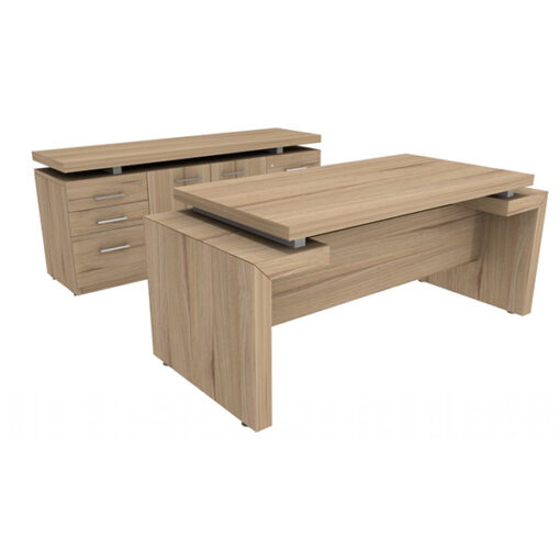 Conjunto ejecutivo formado por escritorio diseño tambor, cubierta flotante. Credenza posterior cubierta flotante, 2 cajones papeleros, 3 cajones de archivo y 2 puertas abatibles con entrepaño interior, no incluye cerradura. Medidas de Escritorio: 180x80x79 (Patas 7cm. y cubierta 5cm. en tambor) y Credenza: 180x40x79 (Cubierta tambor 7cm.)