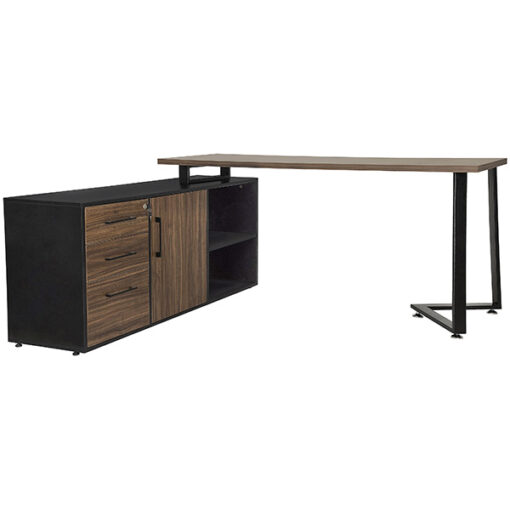 Escritorio semiejecutivo en “L”, cubierta en melamina de 28 mm. y canto rigido en PVC del mismo tono de la cubierta, estructura metálica rectangular de 2¼”x3/4” cal. 18, terminado en pintura epóxica electrostatica, credenza lateral fabricada en melamina de 16 mm., con cajones (2 lapiceros y 1 archivo) con chapa de seguridad,
