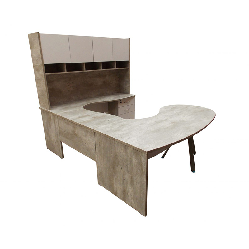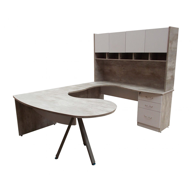 Conjunto ejecutivo formado por escritorio ejecutivo de gota con pedestal de 10″ fabricado en melamina de 28 mm color a elección con cantos en PVC termo adherido, puente conector, credenza ejecutiva con cajonera 2+1 ó 1+1, librero para sobreponer en credenza con puertas abatibles o corredizas superiores, 5 huecos inferiores tipo semanario. Medidas totales 1.80×2.40×1.80 altura 1.85, VARIAS MEDIDAS DISPONIBLES