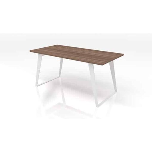 Escritorio cubierta en melamina de 28 mm con cantos de PVC, estructura metálica de hierro plano, 2 patas de tubo pentagonal de 55 x 55 x 7 mm, 2 travesaños rectangulares de 50 x 25 x 1.2 mm, nivelador de altura ajustable, puntos de fijación para cubierta. Medidas: 160x80x75 cm.