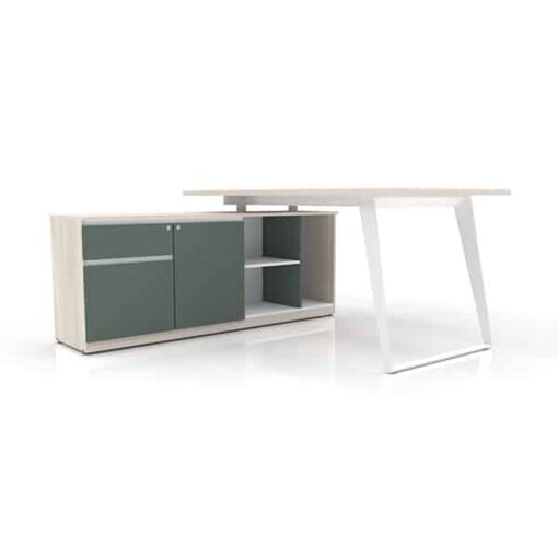Escritorio Lateral con credenza, cubierta en melamina de 28 mm con cantos de PVC, credenza lateral baja, estructura lateral metálica de hierro plano, 1 pata de tubo pentagonal de 55 x 55 x 7 mm, 3 travesaños rectangulares de 50 x 25 x 1.2 mm, nivelador de altura ajustable, puntos de fijación para cubierta. Medidas de base: 160x80x75 cm, credenzas miden 160x40x64