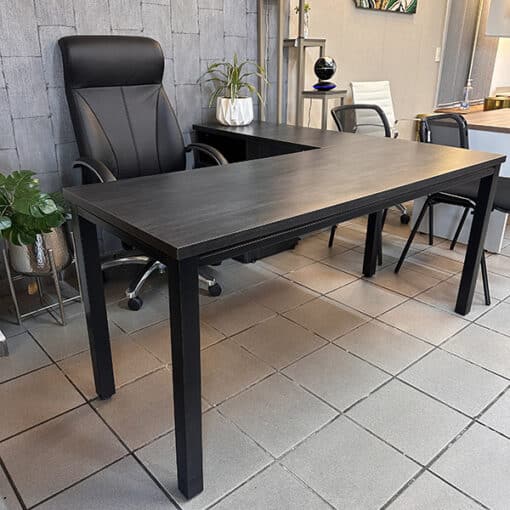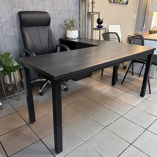 Escritorio operativo fabricado en melamina color turmalina con estructura tubular cuadrado 2″x2″ color negro, cubierta de trabajo en medidas 1.60×0.60 con lateral de 1.00×0.45 con cajonera de un espacio, una cajón y una gaveta para archivo, mecanismo de cierre general con llave, medidas totales 1.60×1.60×0.75