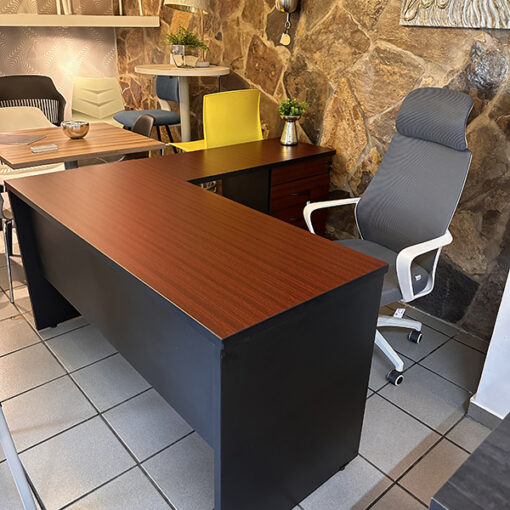 Escritorio operativo en «L» fabricado en melamina 28mm de espesor color caoba/negro con cantos PVC termoadherido, cubierta de trabajo en medidas de 1.50×0.60 con lateral de 1.00×0.45, cajonera de dos cajones y una gaveta para archivo con mecanismo de cierre general con llave, medidas totales 1.50×1.60×0.75
