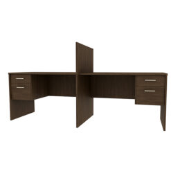 Escritorio modular doble, medidas 1.20×0.60×0.75 (cada puesto), con cajonera de un cajón y una gaveta para archivo con mecanismo de cierre general con llave, mampara divisoria central de 1.20 de alto fabricado en melamina 28mm de espesor cantos PVC termoadherido, medidas totales 2.40×0.60×0.75 (mamparas adicionales opcionales)