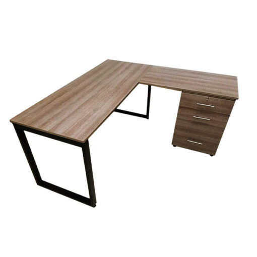 Escritorio operativo en «L» estructura metálica en tubular cuadrado 2″x2″ fabricado en melamina 28mm de espesor color a elección cantos PVC, medidas 1.60×0.60, lateral de 1.00×0.45 cajonera de dos cajones y una gaveta para archivo tamaño oficio con chapa y llave, medidas totales 1.60×1.60×0.75 (disponible en varias medidas)