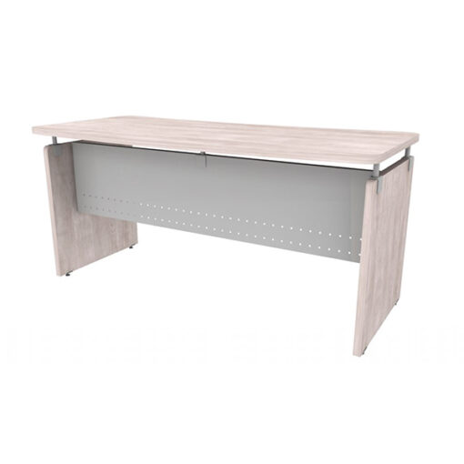 Escritorio operativo fabricado en melamina color a elección con cantos en PVC, diseño en grapa con cubierta flotante, con faldón metálico multiperforado. Medidas: 160x70x75cm.