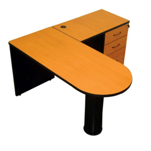 Conjunto operativo formado por escritorio peninsular bala medidas 1.50×0.60×0.75 con lateral de 0.90×0.45 cajonera de dos cajones y una gaveta para archivo, medidas totales 1.50×1.50×0.75, fabricado en melamina 28mm de espesor color a elección cantos PVC, varias medidas disponibles