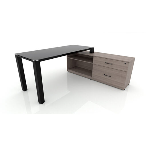 Conjunto secretarial con cubierta cristal inastillable, estructura metálica patas tubular cuadrado de 3″ credenza lateral con cajonera horizontal, cajón papelero, cajón de archivo y dos claros organizadores, tamaño carta, incluye cerradura múltiple. Medidas de Escritorio: 160x70x75 y Credenza:160x40x60