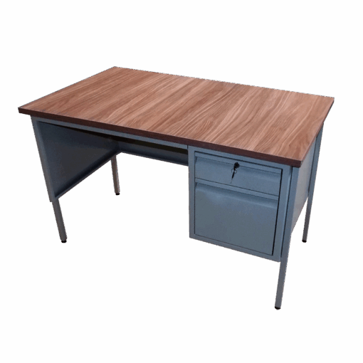 Escritorio metálico secretarial, fabricado en lámina de acero calibre 24 con cubierta en melamina 28mm de espesor color a elección cantos PVC, medidas 1.20×0.60×0.75, con cajonera de un cajón y una gaveta para archivo, varias medidas disponibles
