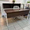 Conjunto secretarial con cubierta en melamina de 28mm. con detalle en cristal esmerilado, pata estilo patín, faldón metálico perforado, con lateral flotada y archivero pedestal, 1 cajon papelero y 1 cajon de archivo, tamaño oficio. *Cristal no templado, medidas Escritorio: 140x60x75 y Lateral: 90x50x75 Nogal Neo Con gris