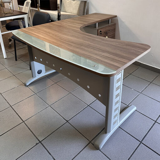 Conjunto secretarial con cubierta en melamina de 28mm. con detalle en cristal esmerilado, pata estilo patín, faldón metálico perforado, con lateral flotada y archivero pedestal, 1 cajon papelero y 1 cajon de archivo, tamaño oficio. *Cristal no templado, medidas Escritorio: 140x60x75 y Lateral: 90x50x75 Nogal Neo Con gris