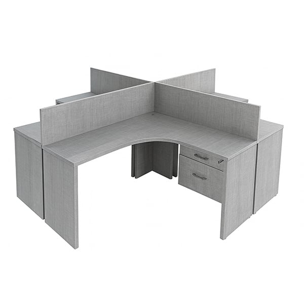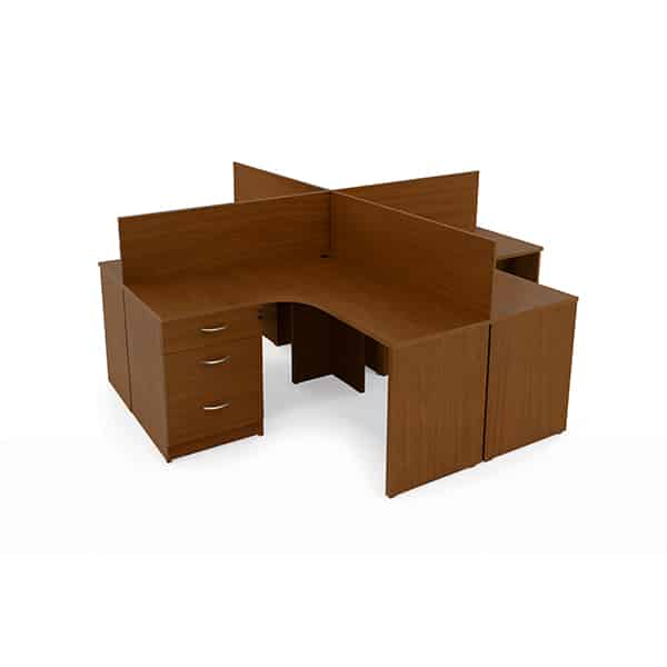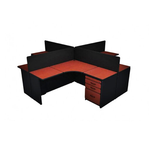 Escritorio para Oficina tipo módulo de trabajo cruceta, fabricado en melamina 28mm de espesor color a elección con cantos PVC con mampara sobre cubierta, 4 puestos de trabajo con cajonera de un cajon y una gaveta para archivo tamaño oficio, medidas totales 3.20×2.40×0.75