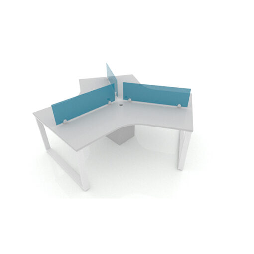 Estación de trabajo tipo Triceta cubierta en melamina 28mm. con canto PVC y estructura metálica 3″x1″ tubular rectangular cal.18 en pintura horneada, nivelador de altura ajustable. Para 3 usuarios, Diámetro: 268cm. Altura: 75cm.Área de usuario: Escuadra de 120x120cm. 60cm. de profundidad, *Incluye mampara en melamina 16mm (opcional mampara de cristal inastillable de color)