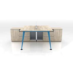 Isla de trabajo 2 usuarios, cubierta de melamina con cantos de PVC, 2 credenzas laterales, estructura metálica de aluminio, 4 patas, 4 travesaños rectangulares de 50 x 25 x 1.2 mm, nivelador de altura ajustable, puntos de fijación para cubierta, mampara en melamina de 16 mm y pasacables. Medidas base: 120x120x75 cm. Área de usuario: 60x120x75 cm. Credenzas: 120x40x64 cm. Mamparas: 110×30 cm. (Base color negro, blanco, gris o Azul)