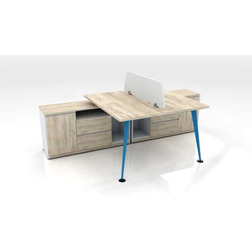 Isla de trabajo 2 usuarios, cubierta de melamina con cantos de PVC, 2 credenzas laterales, estructura metálica de aluminio, 4 patas, 4 travesaños rectangulares de 50 x 25 x 1.2 mm, nivelador de altura ajustable, puntos de fijación para cubierta, mampara en melamina de 16 mm y pasacables. Medidas base: 120x120x75 cm. Área de usuario: 60x120x75 cm. Credenzas: 120x40x64 cm. Mamparas: 110×30 cm. (Base color negro, blanco, gris o Azul)