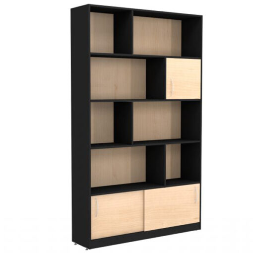 Librero de piso con 7 huecos organizadores, 1 puerta abatible y 2 puertas corredizas inferiores. Fabricado en melamina de 16mm. varios colores a elegir, medidas: 120x30x200cm.