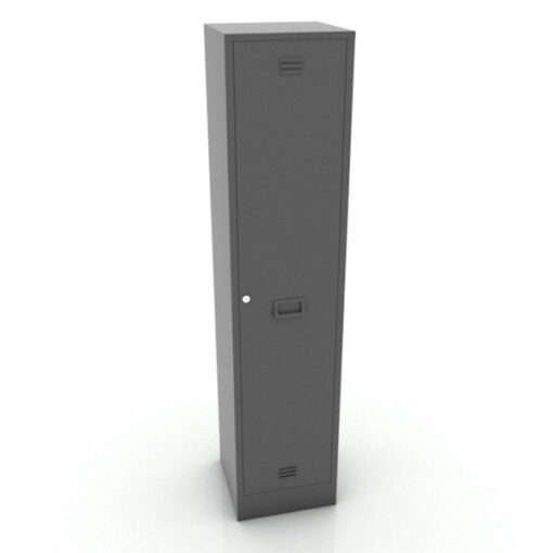 Locker metálico con diseño de ventilas, jaladera con porta etiqueta y porta candado individual (candado no incluido) de una puerta, disponible en calibre 22 y 24. Medidas: 40*40*180cm