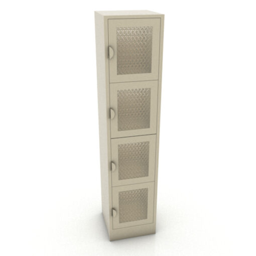 Locker metálico de 4 puertas con malla tramada y jaladera con porta candado individual, disponible en calibre 22 y 24. Medidas: 40*40*180cm.