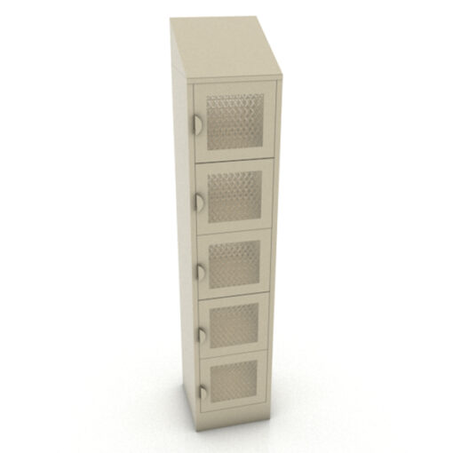 Locker metálico de cinco puertas, con malla tramada y jaladera con porta candado individual, con copete, disponible en calibre 22 y 24. Medidas: 40*40*200cm.